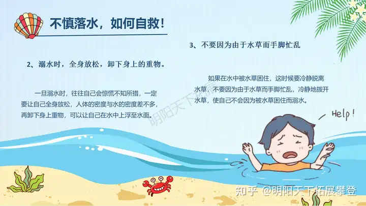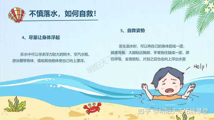 1.不熟悉水性者自救方法除呼救外,取仰卧位,头部向后,使鼻部可露出水面呼吸。呼气要浅,吸气要深。因为深吸气时,人体比重降到比水略轻,可浮出水面,此时千万不要将手臂上举乱扑动,而使身体下沉更快。2.水中抽筋自救法抽筋的主要部位是小腿和大腿,有时手指、脚趾及胃部等部位也会抽筋。