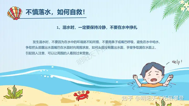 5在海中,如果皮肤受伤出血,应立即上岸,6遇到有人溺水时,应大声喊叫或拨打110请求协助,未学过水上救生,不可贸然下水施救,以免造成溺水事件。