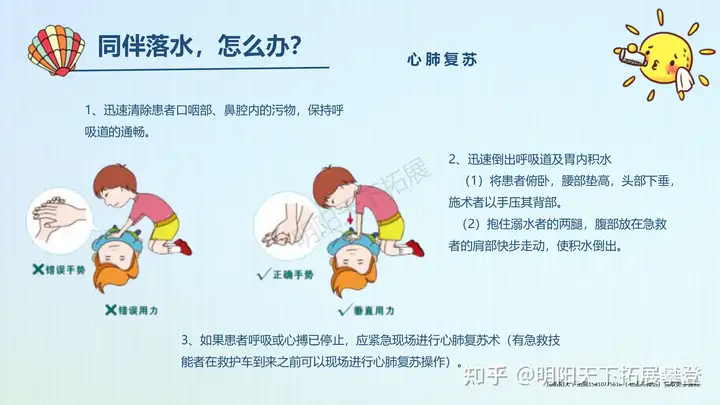 7、在游泳中遇到溺水事故时,现场急救刻不容缓,心肺复苏最为重要。将溺水者救上岸后,要立即清除口腔、鼻咽腔的呕吐物和泥沙等杂物,保持呼吸通畅;应将其舌头拉出,以免后翻堵塞呼吸道;将溺水者的腹部垫高,使胸及头部下垂,或抱其双腿将腹部放在急救者肩部,做走动或跳动倒水动作。恢复溺水者呼吸是急救成败的关键,应立即进行人工呼吸,可采取口对口或口对鼻的人工呼吸方式,在急救的同时应迅速送往医院救治。