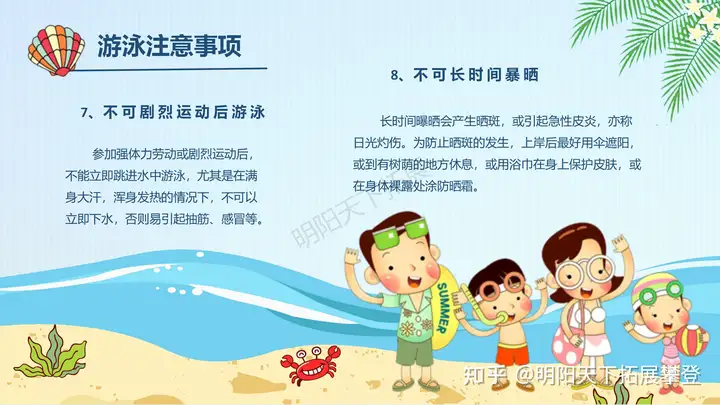 家长带孩子出去旅游时海滩游泳安全常识1应在设有救生人员值勤的海域游泳,并听从指导及勿超越警戒线。