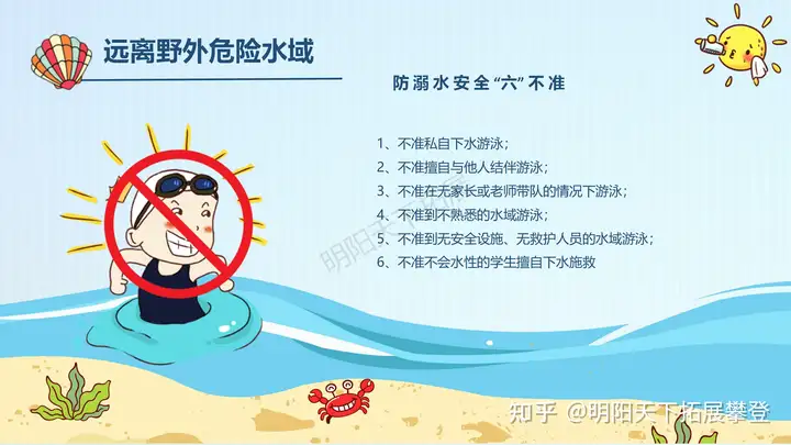 3、要清楚自己的身体健康状况,平时四肢就容易抽筋者不宜参加游泳或不要到深水区游泳。要做好下水前的准备,先活动活动身体,如水温太低应先在浅水处用水淋洗身体,待适应水温后再下水游泳;镶有假牙的同学,应将假牙取下,以防呛水时假牙落入食管或气管。4、对自己的水性要有自知之明,下水后不能逞能,不要贸然跳水和潜泳,更不能互相打闹,以免喝水和溺水。不要在急流和漩涡处游泳,更不要酒后游泳。