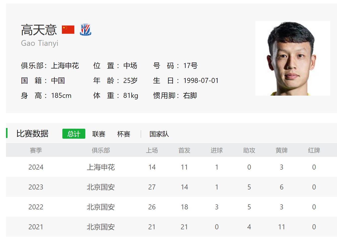 而正值当打之年的高天意,在2024赛季的比赛里面,14次出场,只有3次是替补,进了1个球,看数据也是很优秀的中场球员,有身高,而且还有对坑性,但是他的特点是擅长进攻,面对脚下技术娴熟泰国球员真是怕对方过掉,在新加坡二番战的时候,他的失误,让李源一补锅过来,得了红宝石套餐,被禁赛两场,因此球迷期待高天意单后腰硬扛泰国三箭头,还是不要想太多了。