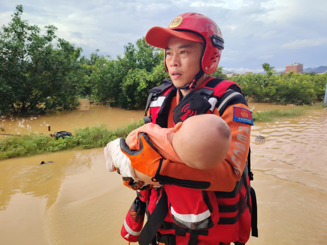 △梅县松口镇石盘村消防员紧急转移一名六个月大的婴儿针对近日来福建、广东两省