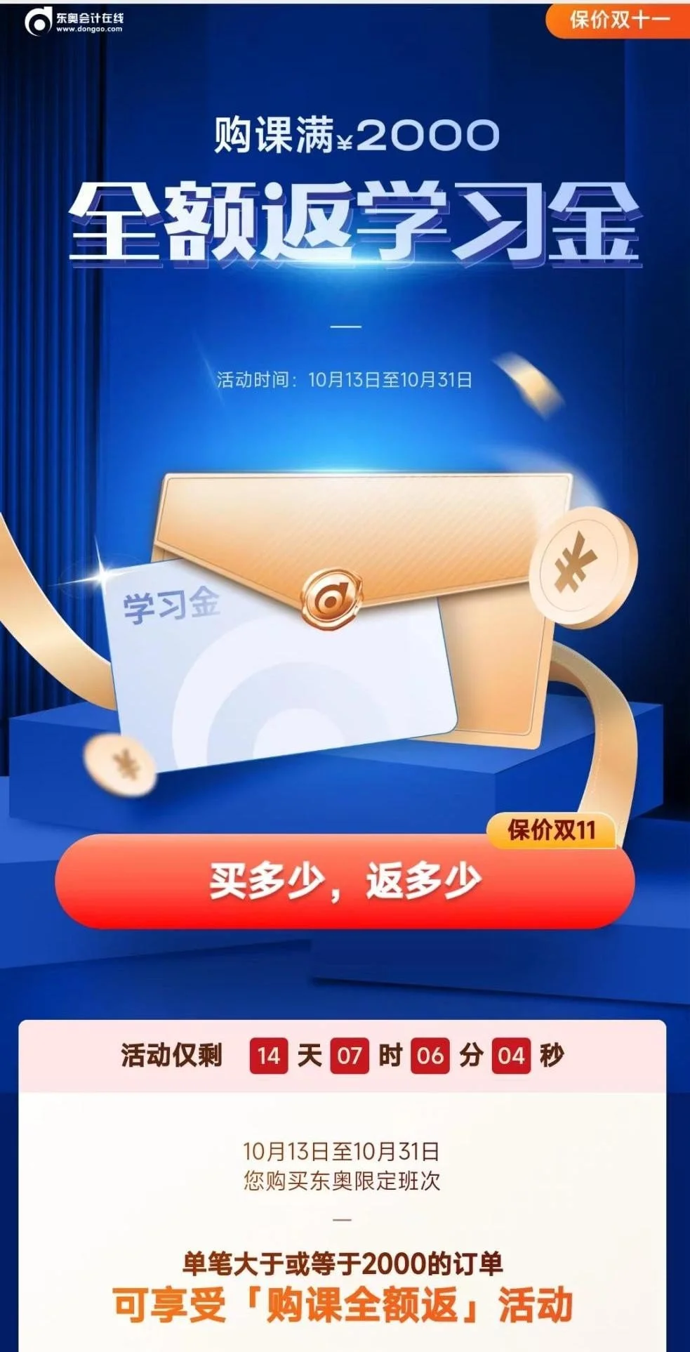 为给备考23年中级会计考试的考生助力,东奥特推出“挑战1年过3科,赢万元奖学金”及“购课全额返”活动,单笔大于或等于¥2000的订单可享受全额返还学习金,小伙伴们可以来“东奥会计在线官网”了解详情!