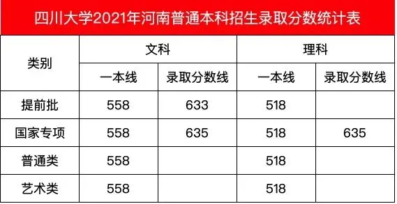 四川大学2021年河南国家专项录取分数线比提前批还要高,文理科最低录取分均为635分,其中理科全省排名第8421名,文科全省排名第1273名。