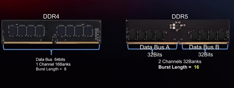 需要注意的是,因为DDR5采用了全新的协议和规范,单个DIMM被分解成2个通道,也就是原本64bit拆解成两个32bit,所以单根内存插入后会被识别成双通道,两根内存识别成四通道。