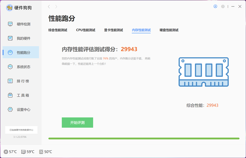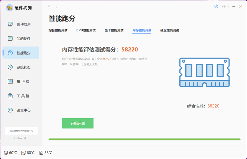 在单通道内存下,硬件狗狗的内存性能测试分数为29943;双通道内存的测试分数为58220。