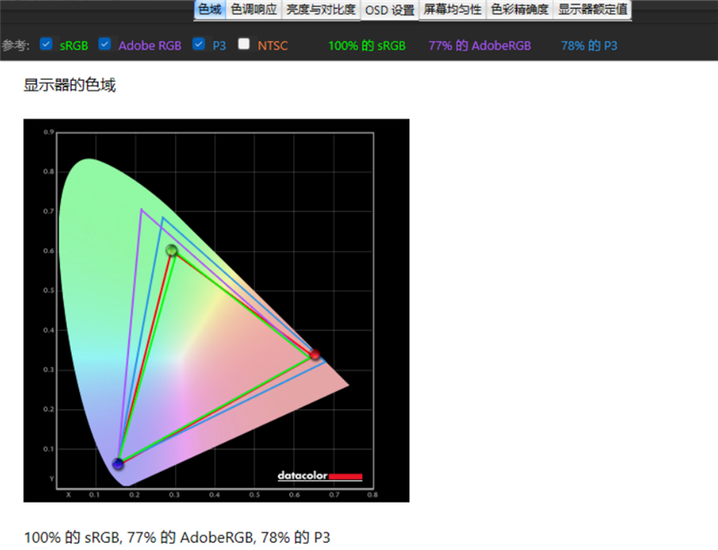 联想小新Air 14的屏幕尺寸为14英寸,分辨率为1920*1080,从实际测试结果中可以看到,这块屏幕支持100%的sRGB、77%的AdobeRGB以及78%的P3色域,成绩相当优秀。
