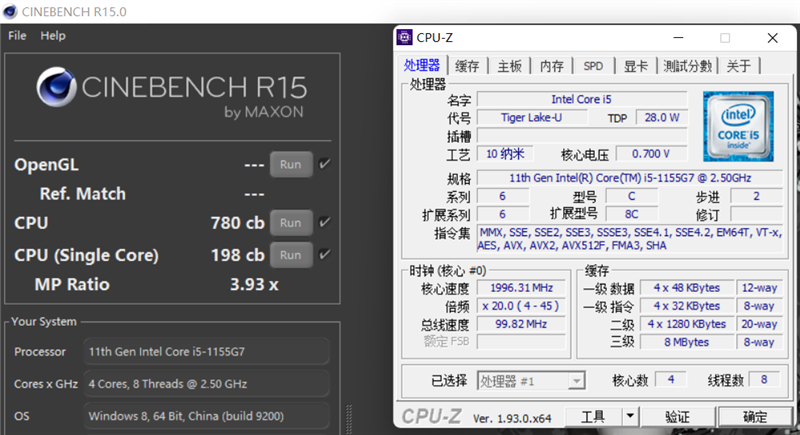 在CINEBENCH R15中,i5-1155G7的单核得分为198,多核得分为780分。