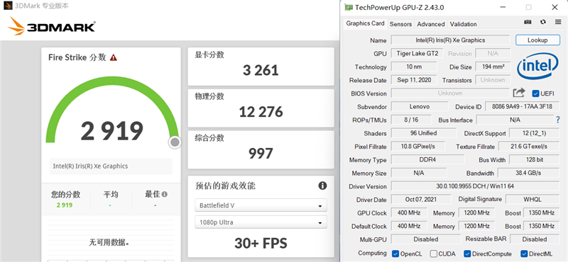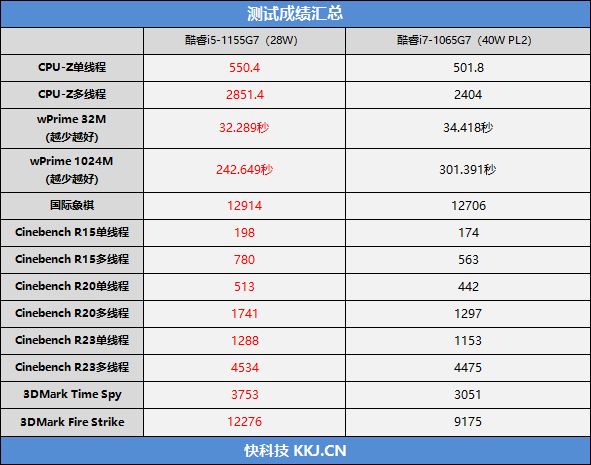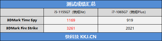 从测试结果不难发现,与上代i7-1065G7相比,i5-1155G7做到了全线碾压,在3DMark Fire Strike中甚至有12276 VS. 9175这样悬殊的比分。
