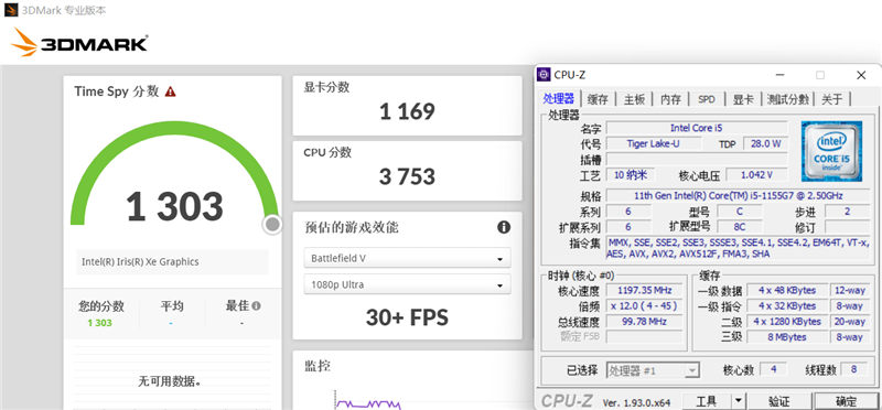 在3DMark Time Spy测试中,i5-1155G7的得分为3753分,i7-1065G7的得分为3051分,两者相差702分,差距依然非常明显。