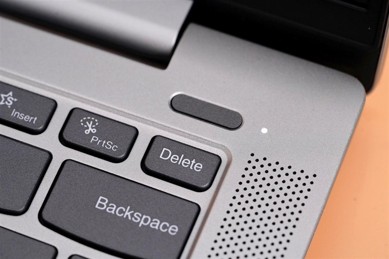 笔记本的电源键采用常见的长条形设计,体积比一般电源键稍大,而且集成了指纹识别功能。