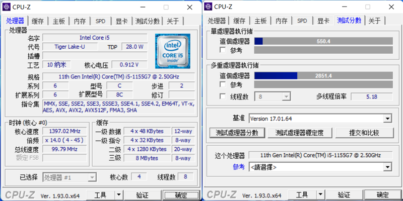 在CPU-Z中,i5-1155G7的单核得分为550.4分,多核得分为2851.4分。