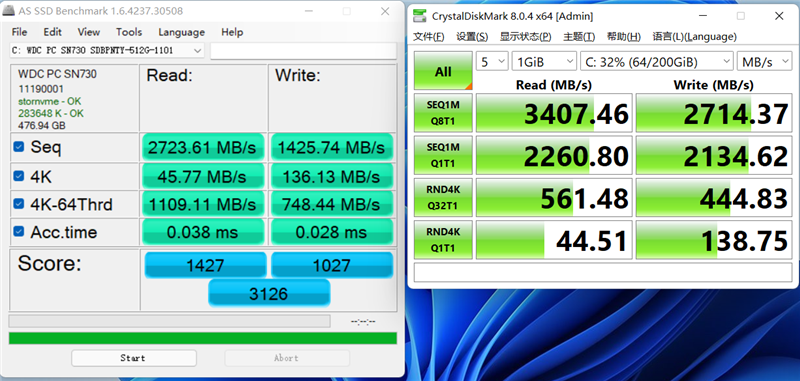 硬盘是西数SN730 512GB,在AS SSD Benchmark测试中,硬盘的顺序读取速度为2723.61MB/s,顺序写入速度为1425.72MBS。