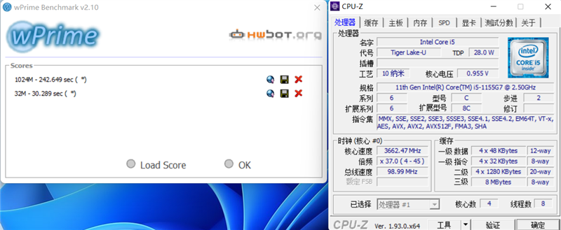 在32M单核测试中,i5-1155G7使用的时间为32.289秒,1024M全核测试使用时间为242.649秒。