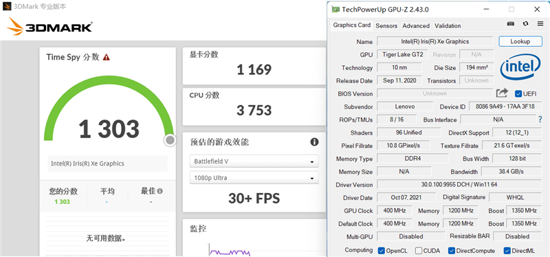 在3DMark Time Spy中,锐炬Xe的分数为1169分。