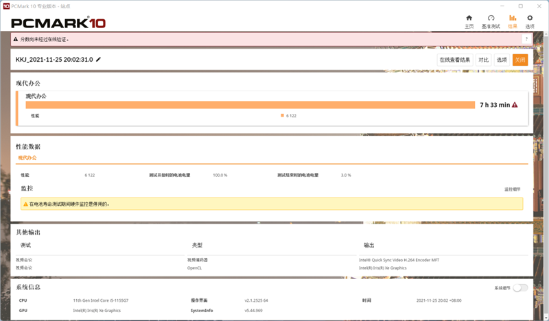 联想小新Air 14的电池容量为56.5Wh,考虑到i5-1155G7出色的功耗控制以及整机情况,续航测试可能会给我们不小的惊喜,我们来看下实测结果。