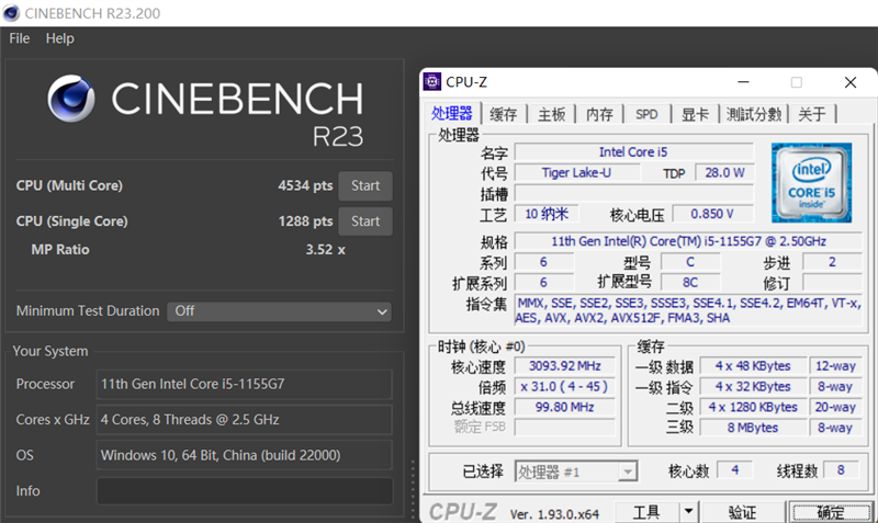 在CINEBENCH R23中,i5-1155G7的单核得分为1288分,多核得分为4534分。