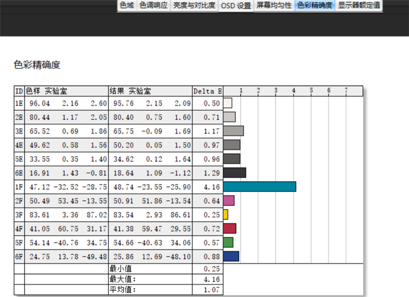 在屏幕色彩精准度测试中,Delta最小值为0.25,最大值为4.16,平均值为1.07。