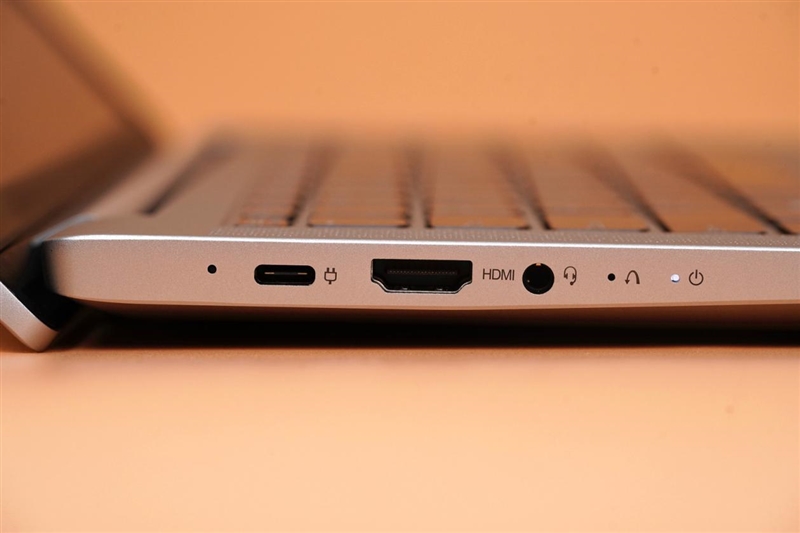 笔记本边框左侧集成了Type-c接口、HDMI接口、耳机麦克风接口、电源指示灯。