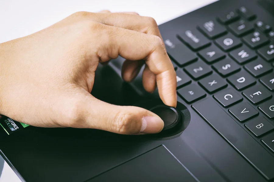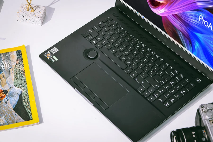 触控板左前方便是醒目的ASUS Dial物理创意旋钮了。支持旋转和按压操控,按压就是“确认”。值得一提的是,这枚ASUS Dial物理创意旋钮的手感很不错,有高级感。