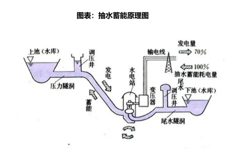 从中国以及全球来看,抽水蓄能是当前最主要的储能方式。所谓抽水蓄能,就是在电网低谷的时候用过剩的电力,把水从下池的水库中抽到上池的水库,转化为重力势能存起来。在电力负荷高峰时,把水放下去发电,这样重力势能就重新转化为电能了。