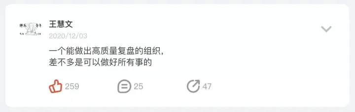 王慧文总是强调要事后复盘。在他仅有的 13 条即刻动态中,就有 2 条提到了复盘的重要性——这一点,其实和上面提到的“相信科学和规律”一脉相承。
