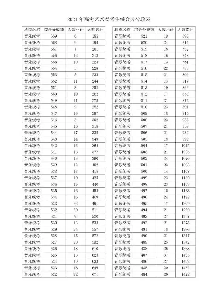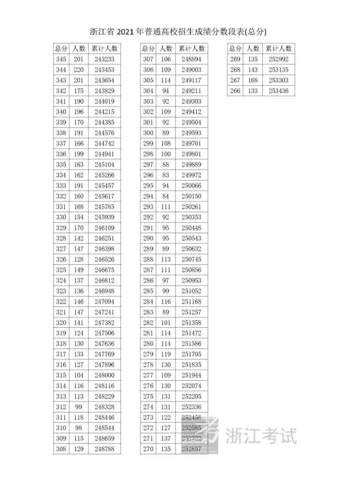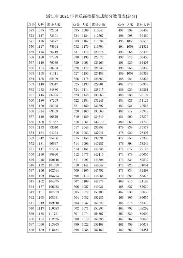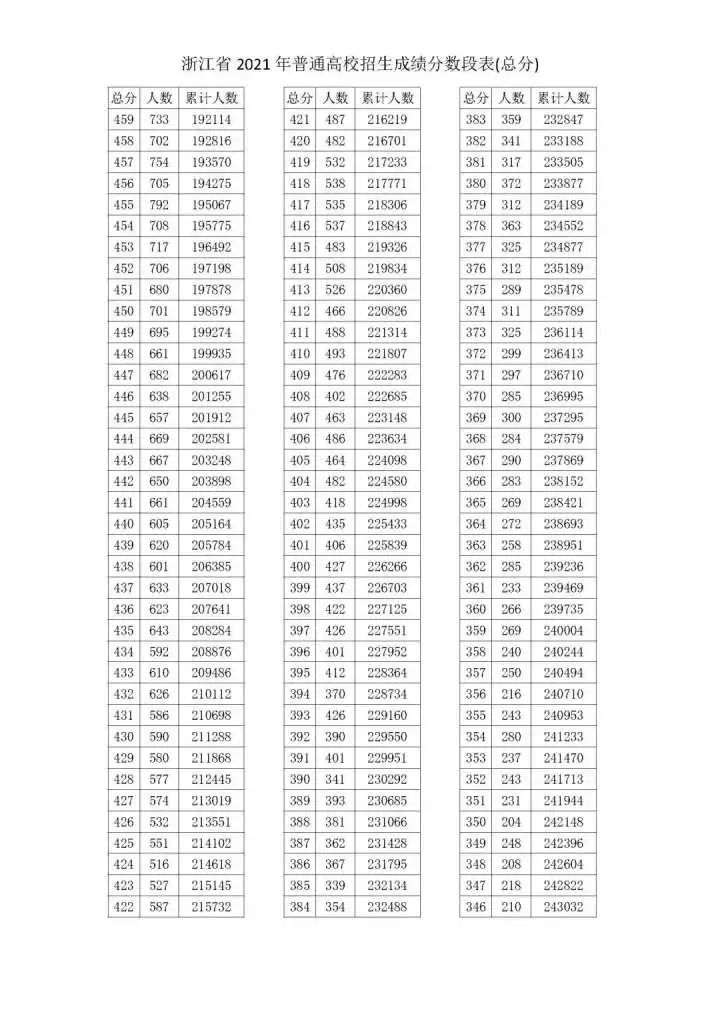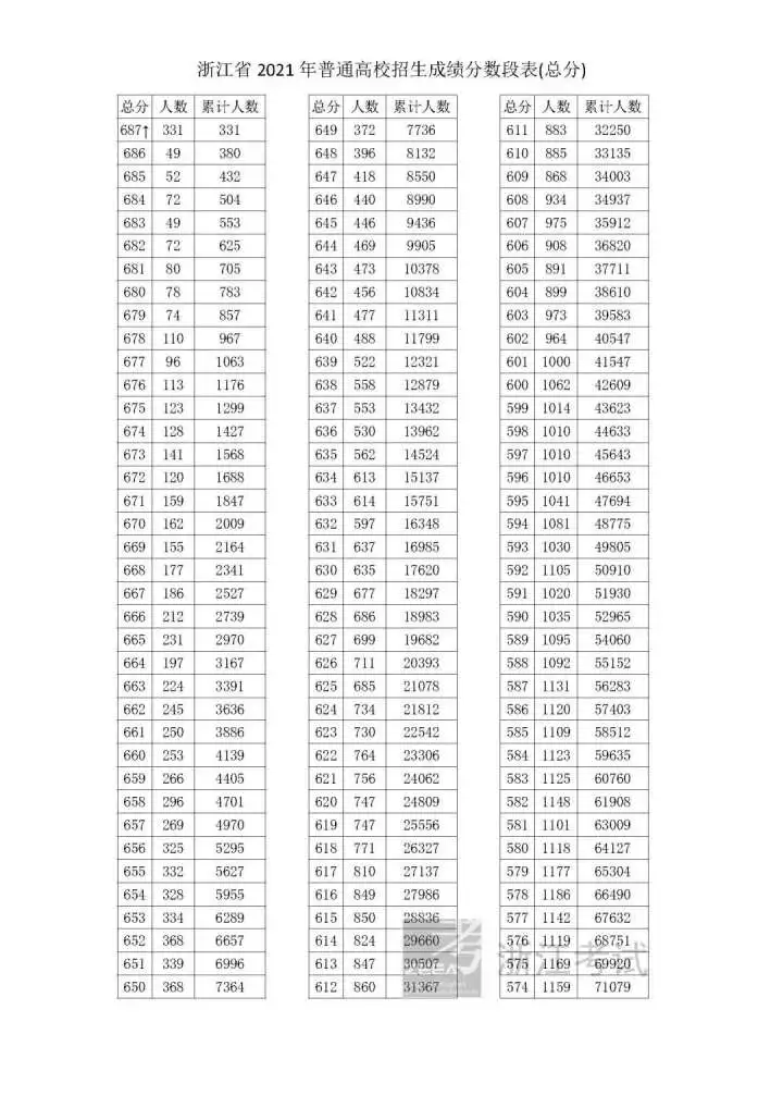 浙江省2021年普通高校招生成绩分数段表(总分)