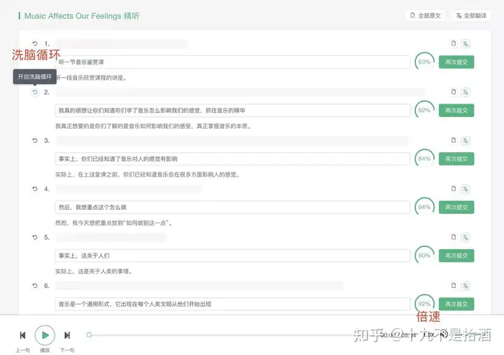 精听系统这种洗脑循环练习方式可以让我在脑子里重复回忆某一句话,记住单词的发音!然后自己继续翻译成中文!可以说是输入和输出两种学习方式同时进行了!