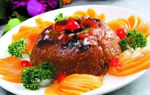 八宝饭作为「兰州八大碗」之一,人们习惯叫它为「甜饭」,软糯香甜。兰州人的甜饭将糯米、蜂蜜、红枣、莲子、蜜饯一起蒸制好,再辅以白糖和干果便成了。如今大多数家庭已经无暇自制甜饭,但甜饭仍然是兰州人过年不可或缺的一道菜。